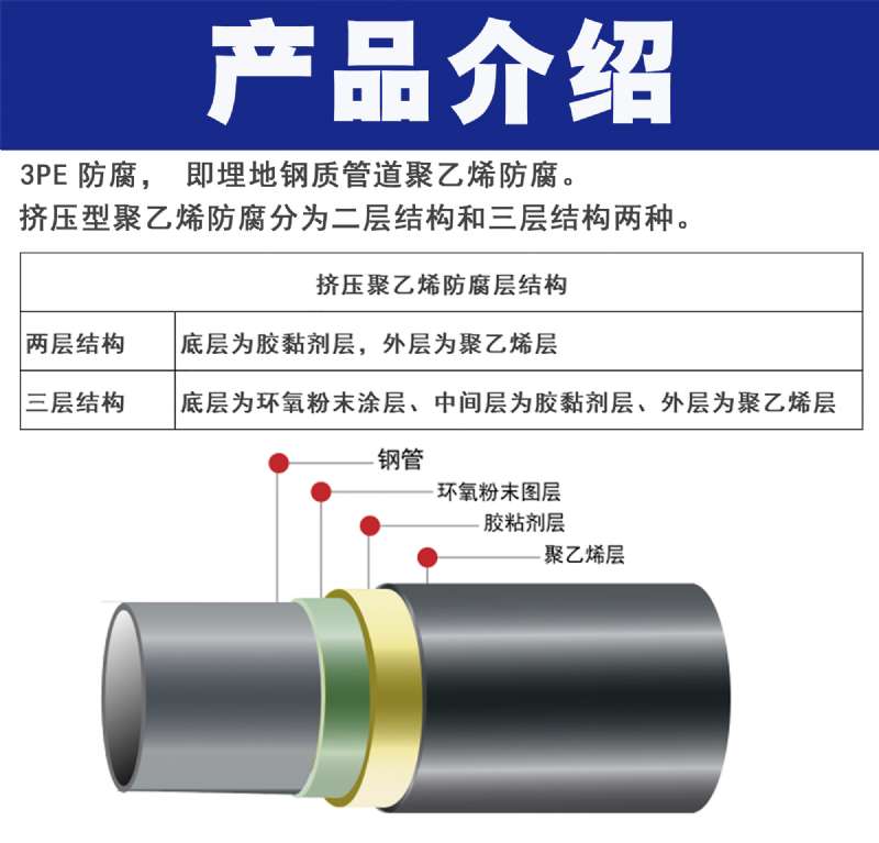 三層防腐結(jié)構(gòu)組成包括: 熔結(jié)環(huán)氧粉末底層、聚合物膠粘劑中間層和聚乙烯面層,其中環(huán)氧粉末底層的作用是形成連續(xù)的涂膜,與鋼管表面粘結(jié)、固化而提供良好的附著力,并具有很好的耐化學(xué)品性和抗陰極剝離能力;聚合物膠粘劑的作用是在環(huán)氧粉末涂料膠化之前與之融合,并與外面的聚乙烯層粘結(jié)
