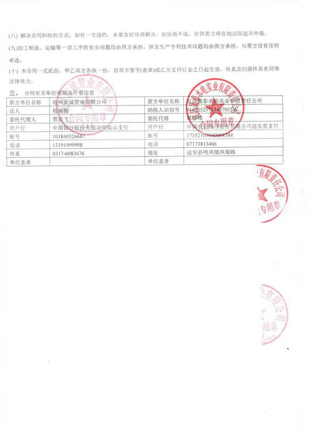 2019年10月23日友誠管業(yè)有限公司于宜昌市晟泰水電實(shí)業(yè)有限責(zé)任公司簽署了柔性承插口連接涂塑鋼管,從開始于譚總交談到來廠里考察,譚總對(duì)我們非常的信任認(rèn)可,我們一如既往的做好每一個(gè)業(yè)務(wù)